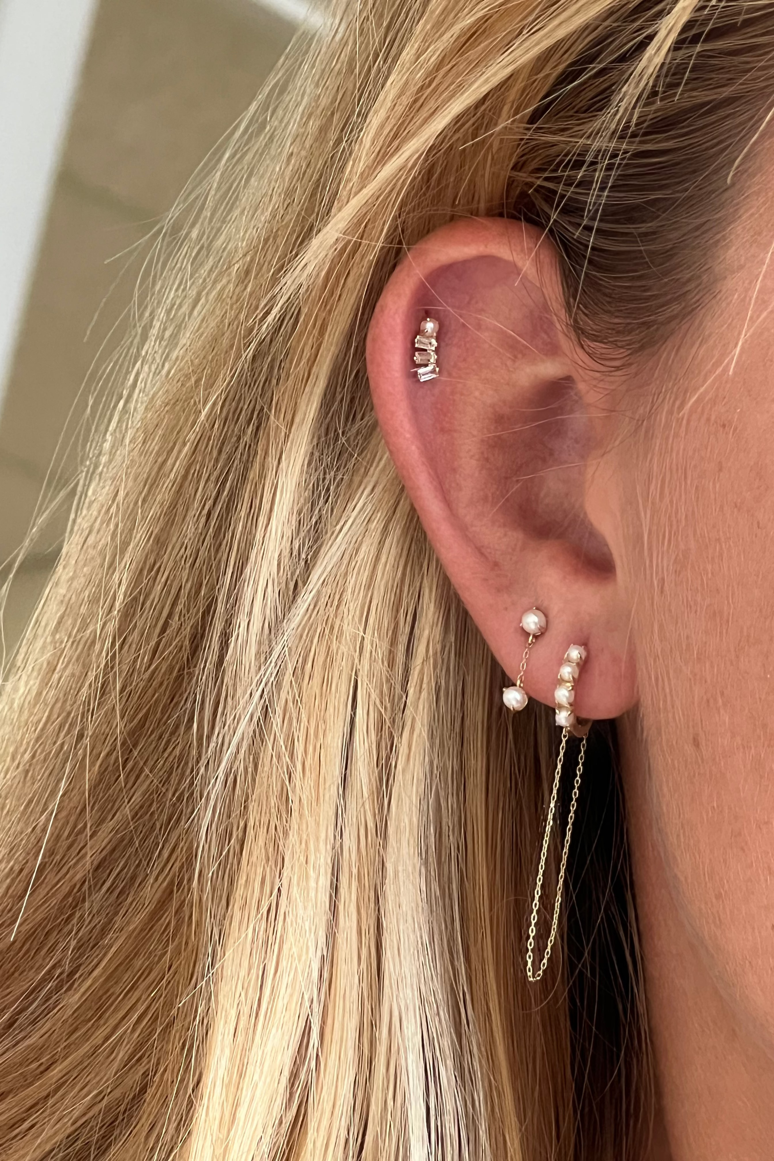 The Diamond Baguette earring features a freshwater pearl trailed by three sparkling ethically sourced natural diamonds, set at a slight curve to follow the contour of your ear.